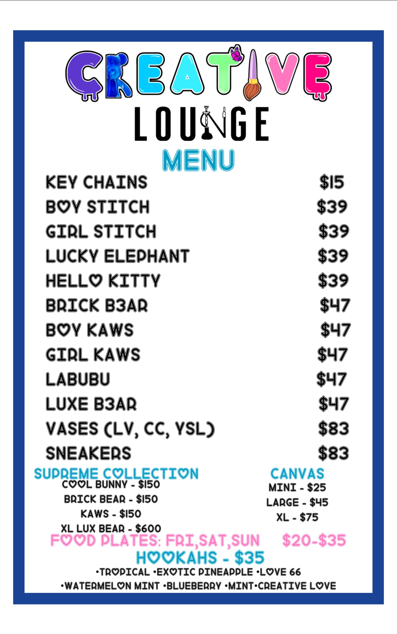 Enjoy a relaxed paint-and-sip experience with BYOB options, plus soft drinks available for purchase. Hookah is available, and food is offered with a rotating menu—so there’s always something new to enjoy while you paint! 🎨🥤🍽️